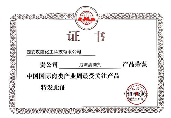 展會(huì)上,漢隆公司為肉類加工企業(yè)提供的產(chǎn)品有堿性泡沫清洗劑、酸性泡沫清洗劑、食品級(jí)過氧化氫消毒劑、食品級(jí)過氧乙酸消毒劑、食品級(jí)次氯酸鈉消毒劑等,滿足全方位的清洗和消毒殺菌。其中“堿性泡沫清洗劑”“酸性泡沫清洗劑”更是廣受好評(píng),關(guān)注度最高,并獲得”中國國際肉類產(chǎn)業(yè)周最受關(guān)注產(chǎn)品”證書。