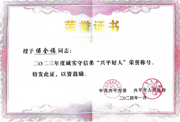 2024年1月被興平市人民政府評為“興平好人”稱號;